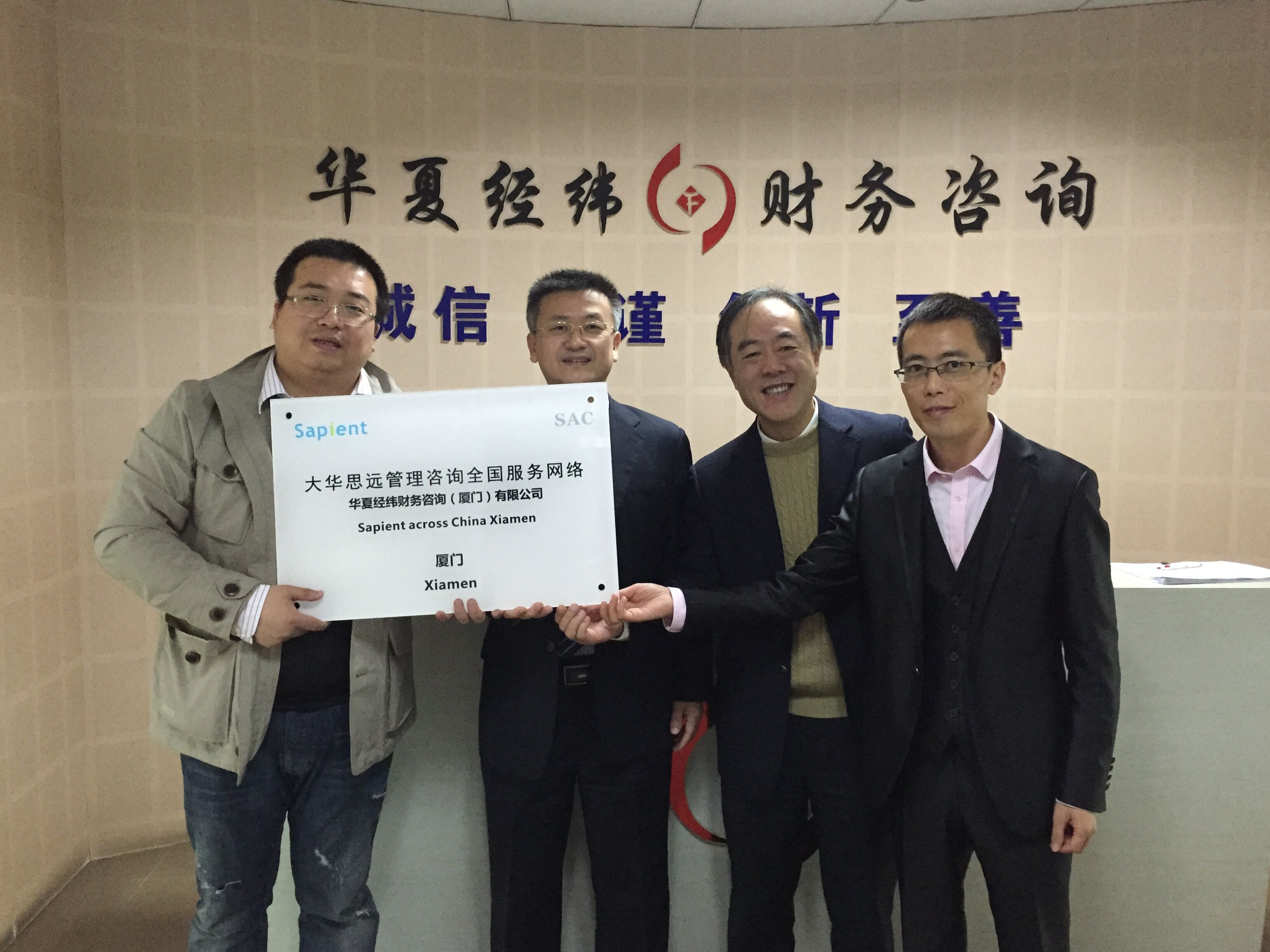 2016年1月6日上午,華夏經(jīng)緯財(cái)務(wù)咨詢(廈門(mén))有限公司與大華思遠(yuǎn)(北京)管理咨詢有限公司戰(zhàn)略合作簽約儀式暨授牌在公司舉行。此次簽約,標(biāo)志著雙方建立了穩(wěn)固的戰(zhàn)略合作伙伴關(guān)系,為華夏經(jīng)緯財(cái)務(wù)咨詢(廈門(mén))有限公司在全國(guó)性戰(zhàn)略布局持續(xù)、健康、快速發(fā)展奠定了良好的基礎(chǔ)。